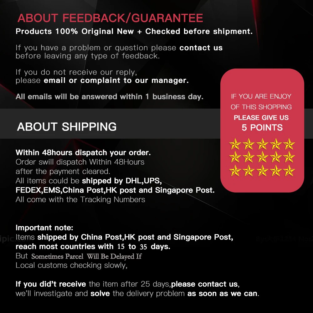 • If you did not receive the product within the guaranteed time( 45 days not including 2-5 day processing) you can request a refund or a reshipment.