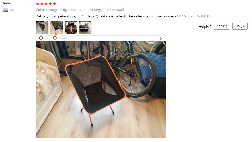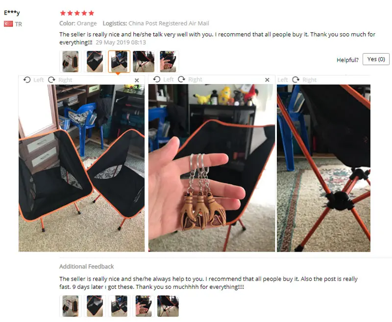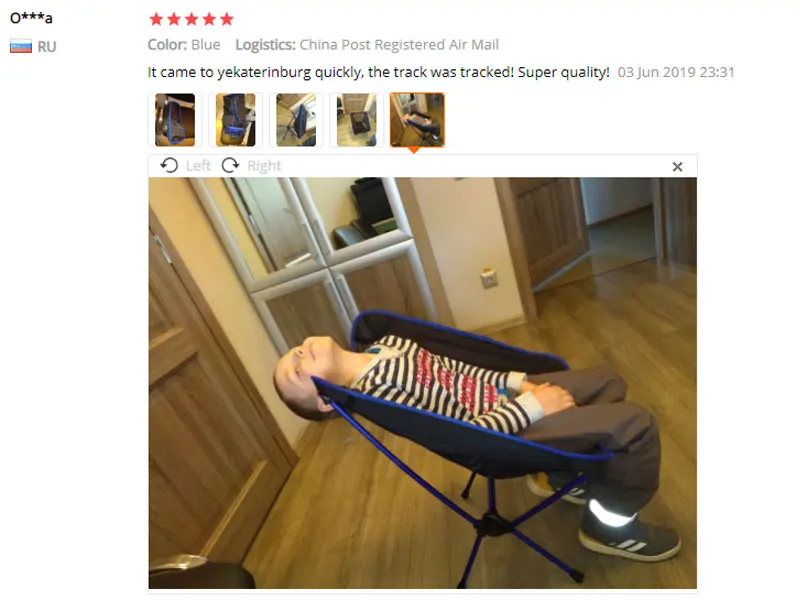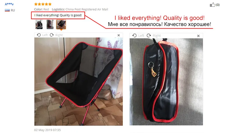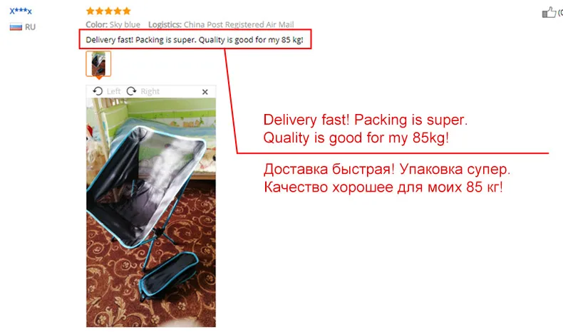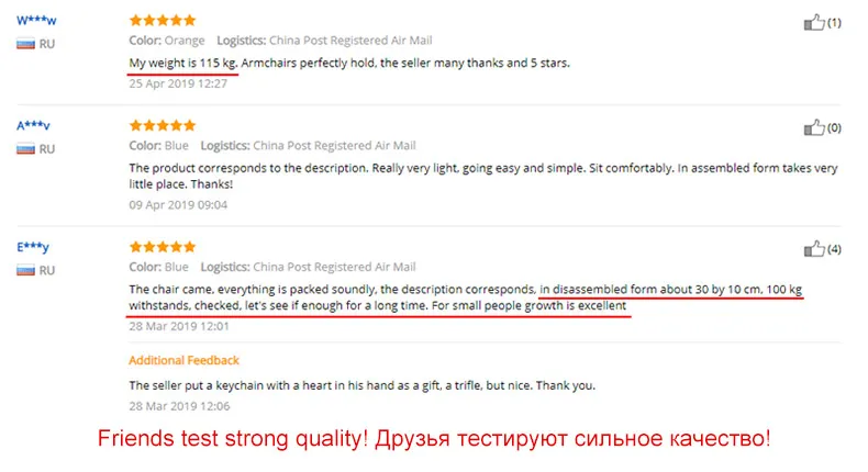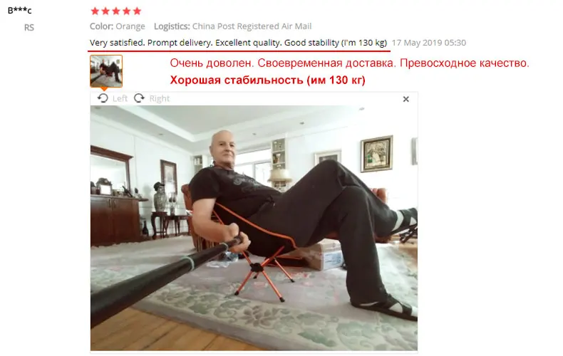The chair was pleasant, comfortable, feels durable, light, does not take up much space in the case, quickly. Delivery from Russia, after 2 days already delivered the Courier (to St. Petersburg). This store had cheaper than others, put the keychain as a gift. I'm happy with the purchase.